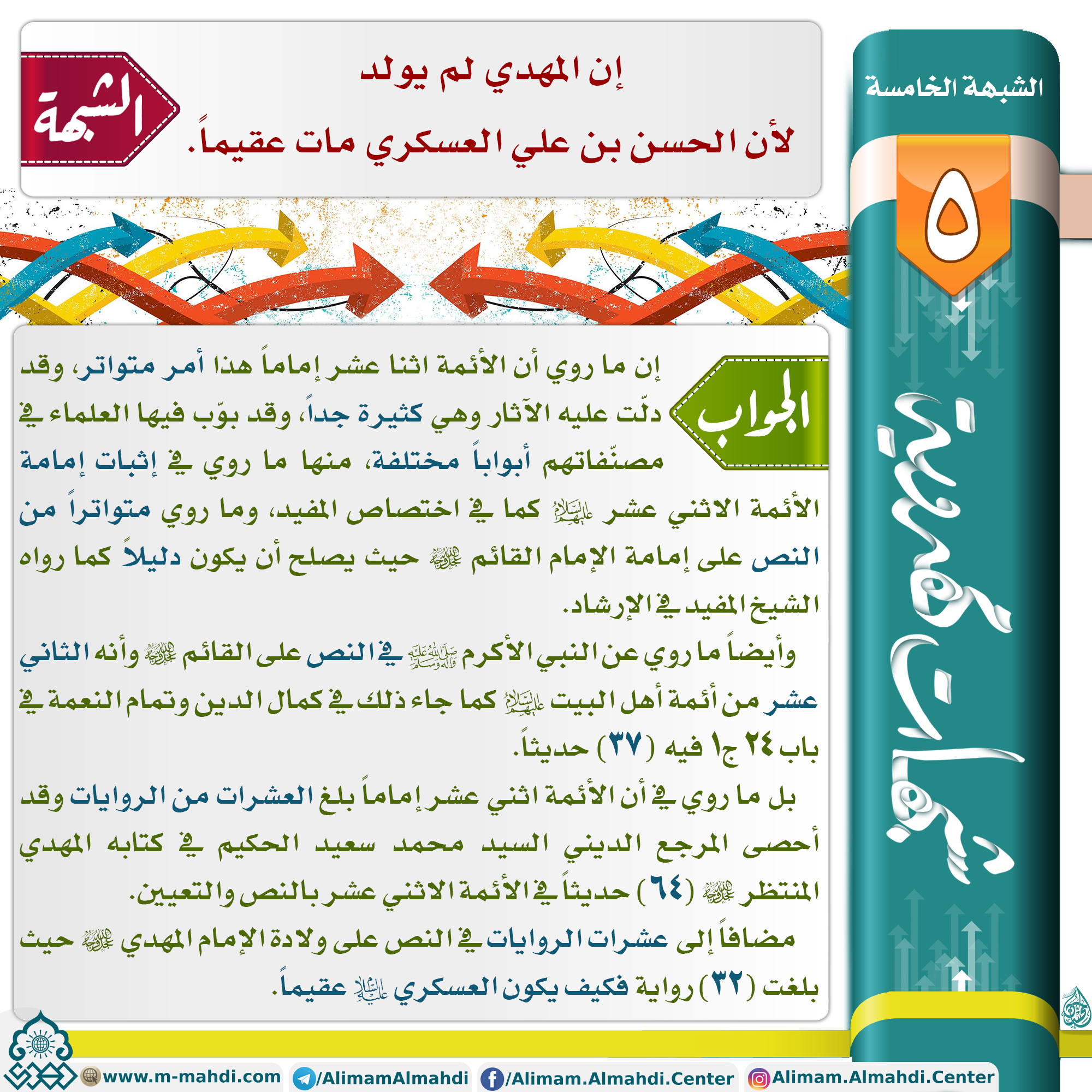 الشيخ حميد عبد الجليل الوائلي الشبهة الخامسة ?الشبهة: ?إن المهدي لم يولد لأن الحسن بن علي العسكري مات عقيماً. ?الجواب: ?إن ما روي أن الأئمة اثنا عشر إماماً هذا أمر متواتر، وقد دلّت عليه الآثار وهي كثيرة جداً، وقد بوّب فيها العلماء في مصنّفاتهم أبواباً مختلفة، منها ما روي في إثبات…