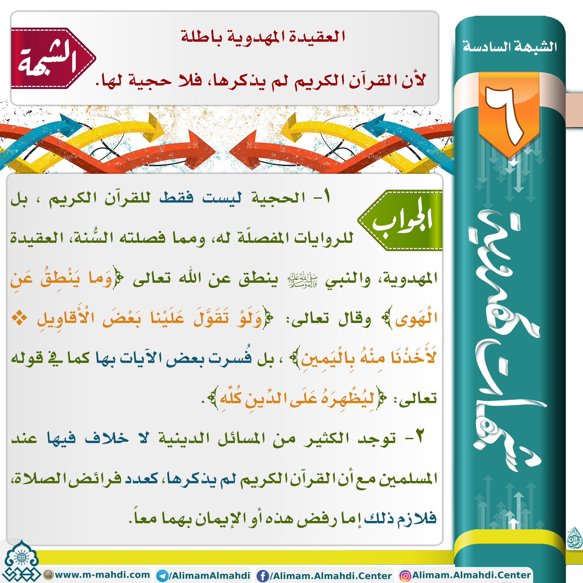 الشيخ حميد عبد الجليل الوائلي الشبهة السادسة ?الشبهة: ?العقيدة المهدوية باطلة لأن القرآن الكريم لم يذكرها، فلا حجية لها. ?الجواب: ? ١– الحجية ليست فقط للقرآن الكريم ، بل للروايات المفصلّة له، ومما فصلته السُّنة، العقيدة المهدوية، والنبي (صلّى الله عليه وآله وسلم) ينطق عن الله تعالى:…