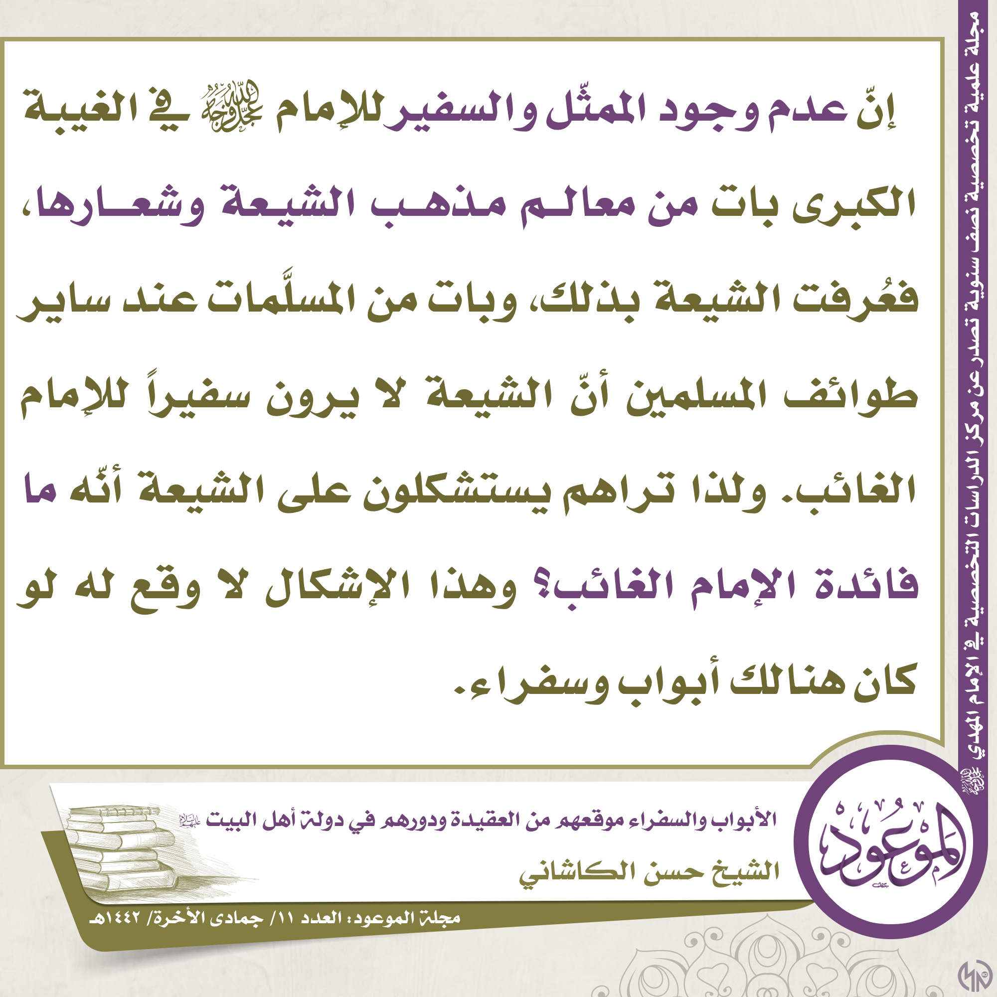 ?العدد ١١/ جمادى الآخرة/ ١٤٤٢ هـ ? مقتطف من مقال: الأبواب والسفراء موقعهم من العقيدة ودورهم في دولة أهل البيت (عليهم السلام) ✍? الكاتب: الشيخ حسن الكاشاني ? للاطلاع على المقال من خلال حقل التحميلات في الأسفل ?