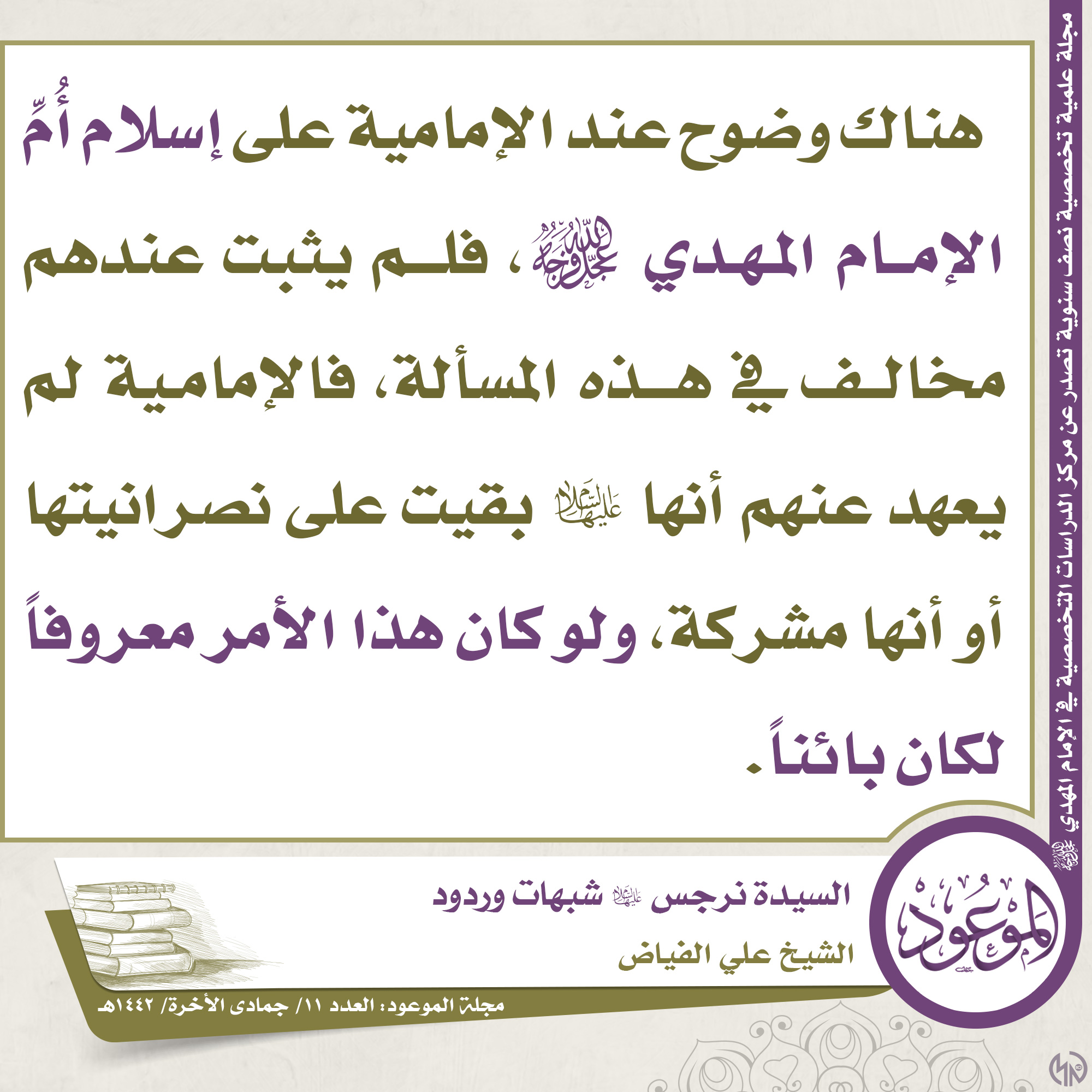 ?العدد ١١/ جمادى الآخرة/ ١٤٤٢ هـ ? مقتطف من مقال: السيدة نرجس (عليها السلام) شبهات وردود ✍? الكاتب: الشيخ علي الفياض ? للاطلاع على المقال من خلال حقل التحميلات في الأسفل ?