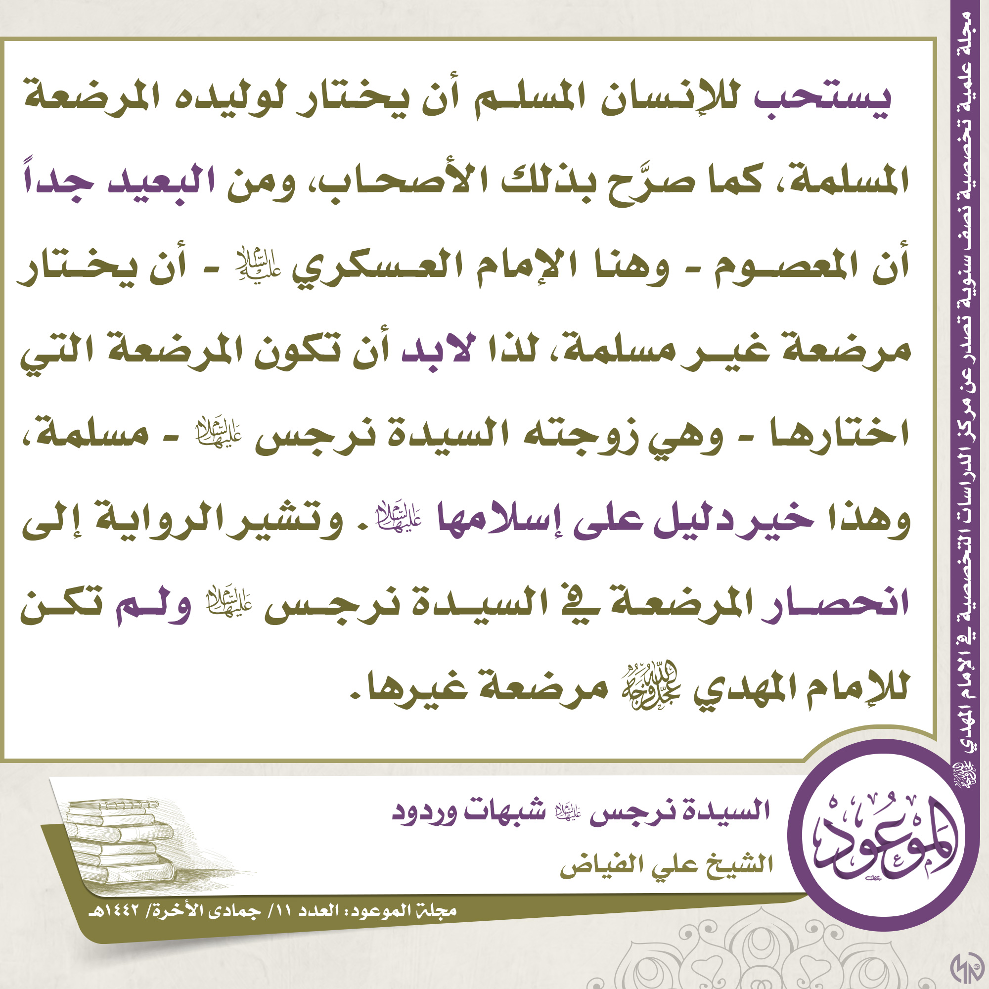 ?العدد ١١/ جمادى الآخرة/ ١٤٤٢ هـ ? مقتطف من مقال: السيدة نرجس (عليها السلام) شبهات وردود ✍? الكاتب: الشيخ علي الفياض ? للاطلاع على المقال من خلال حقل التحميلات في الأسفل ?