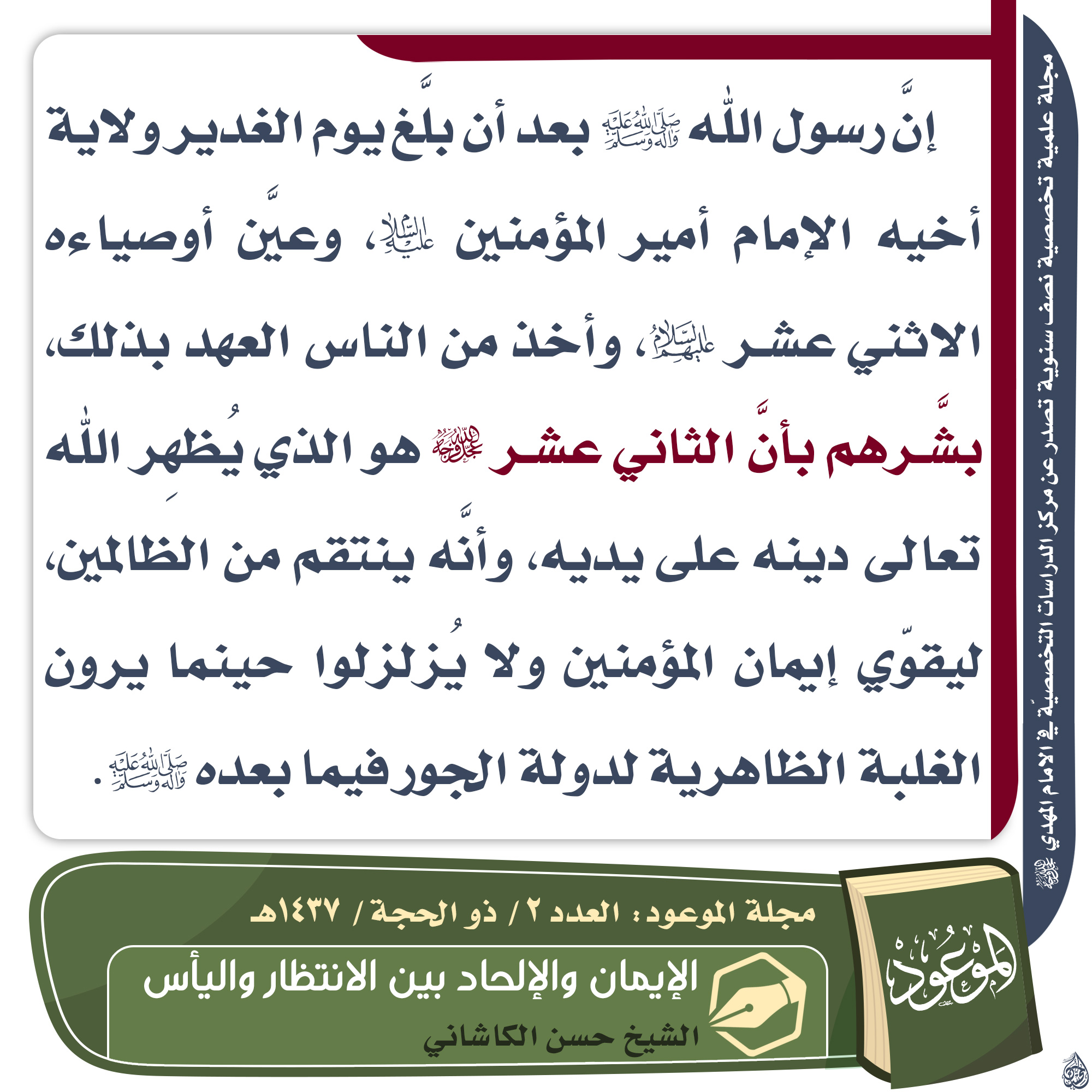 ? إنَّ رسول الله (صلّى الله عليه وآله وسلم) بعد أن بلَّغ يوم الغدير ولاية أخيه الإمام أمير المؤمنين (عليه السلام)، وعيَّن أوصياءه الاثني عشـر (عليهم السلام)، وأخذ من الناس العهد بذلك، بشَّـرهم بأنَّ الثاني عشـر (عجّل الله فرجه) هو الذي يُظهِر الله تعالى دينه على يديه، وأنَّه ينتقم…