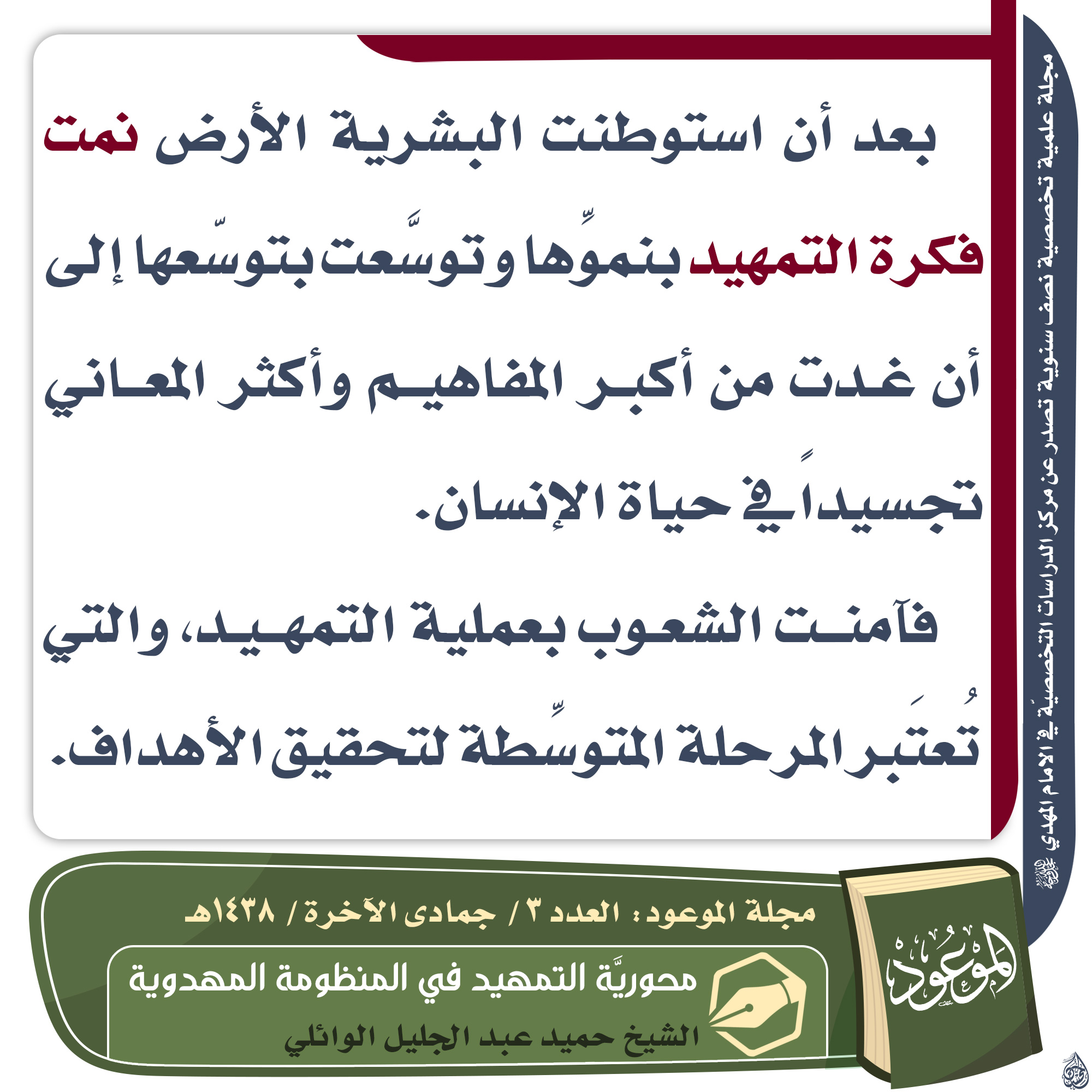 ? بعد أن استوطنت البشرية الأرض نمت فكرة التمهيد بنموِّها وتوسَّعت بتوسّعها إلى أن غدت من أكبر المفاهيم وأكثر المعاني تجسيداً في حياة الإنسان. فآمنت الشعوب بعملية التمهيد، والتي تُعتَبر المرحلة المتوسِّطة لتحقيق الأهداف. ? مقتطف من مقال: محوريَّة التمهيد في المنظومة المهدوية…