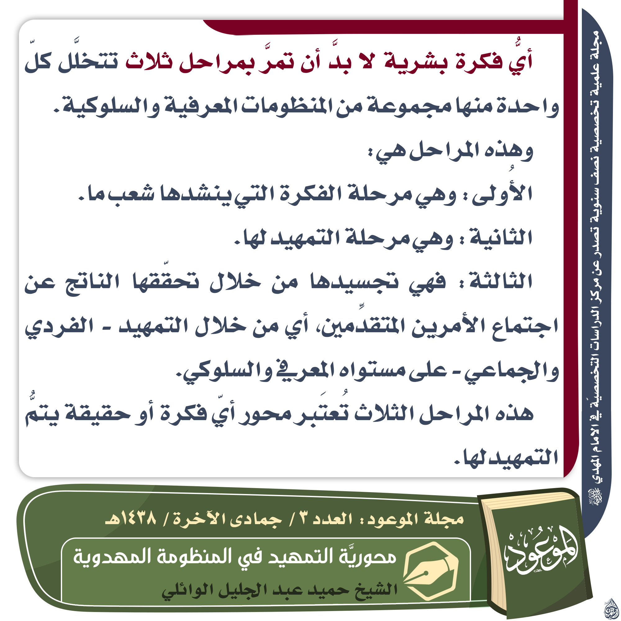 ? أيُّ فكرة بشرية لا بدَّ أن تمرَّ بمراحل ثلاث تتخلَّل كلّ واحدة منها مجموعة من المنظومات المعرفية والسلوكية. وهذه المراحل هي: الأُولى: وهي مرحلة الفكرة التي ينشدها شعب ما. الثانية: وهي مرحلة التمهيد لها. الثالثة: فهي تجسيدها من خلال تحقّقها الناتج عن اجتماع الأمرين المتقدِّمين،…