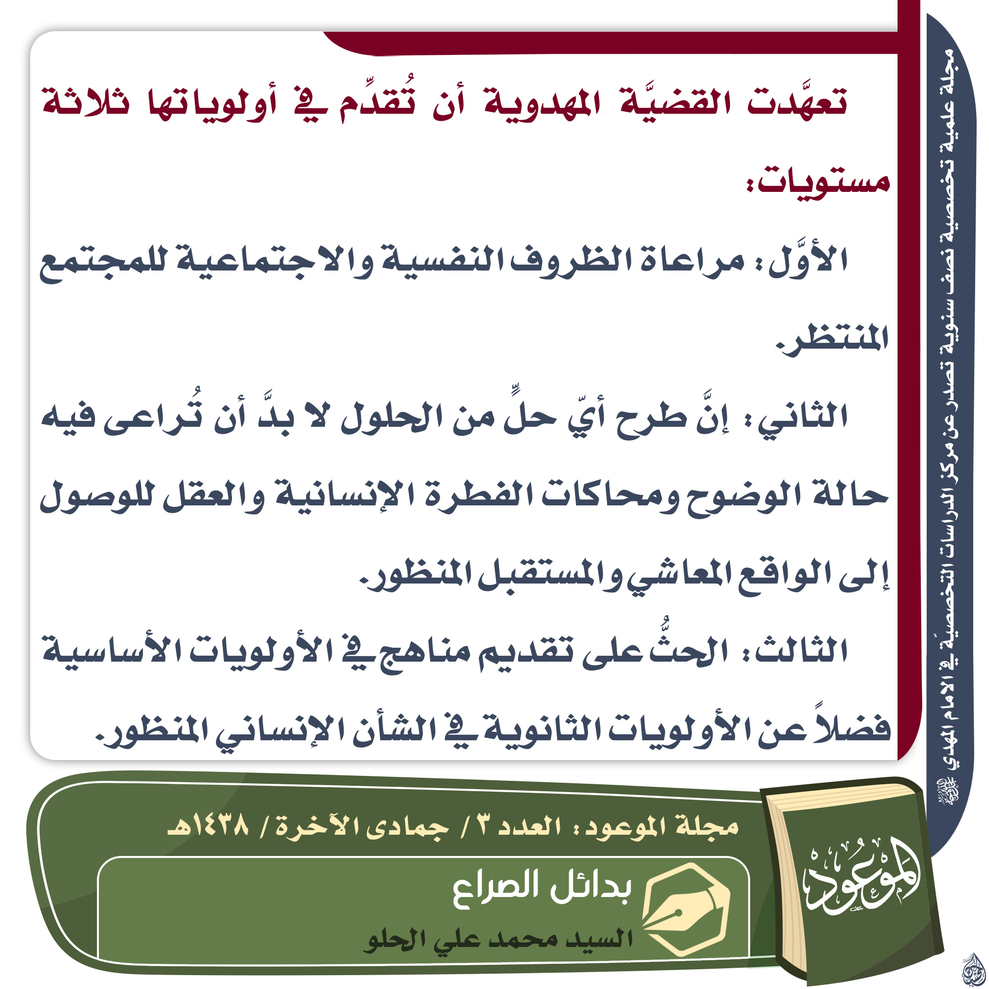 ? تعهَّدت القضيَّة المهدوية أن تُقدِّم في أولوياتها ثلاثة مستويات: الأوَّل: مراعاة الظروف النفسية والاجتماعية للمجتمع المنتظر. الثاني: إنَّ طرح أيّ حلٍّ من الحلول لا بدَّ أن تُراعى فيه حالة الوضوح ومحاكات الفطرة الإنسانية والعقل للوصول إلى الواقع المعاشي والمستقبل المنظور.…