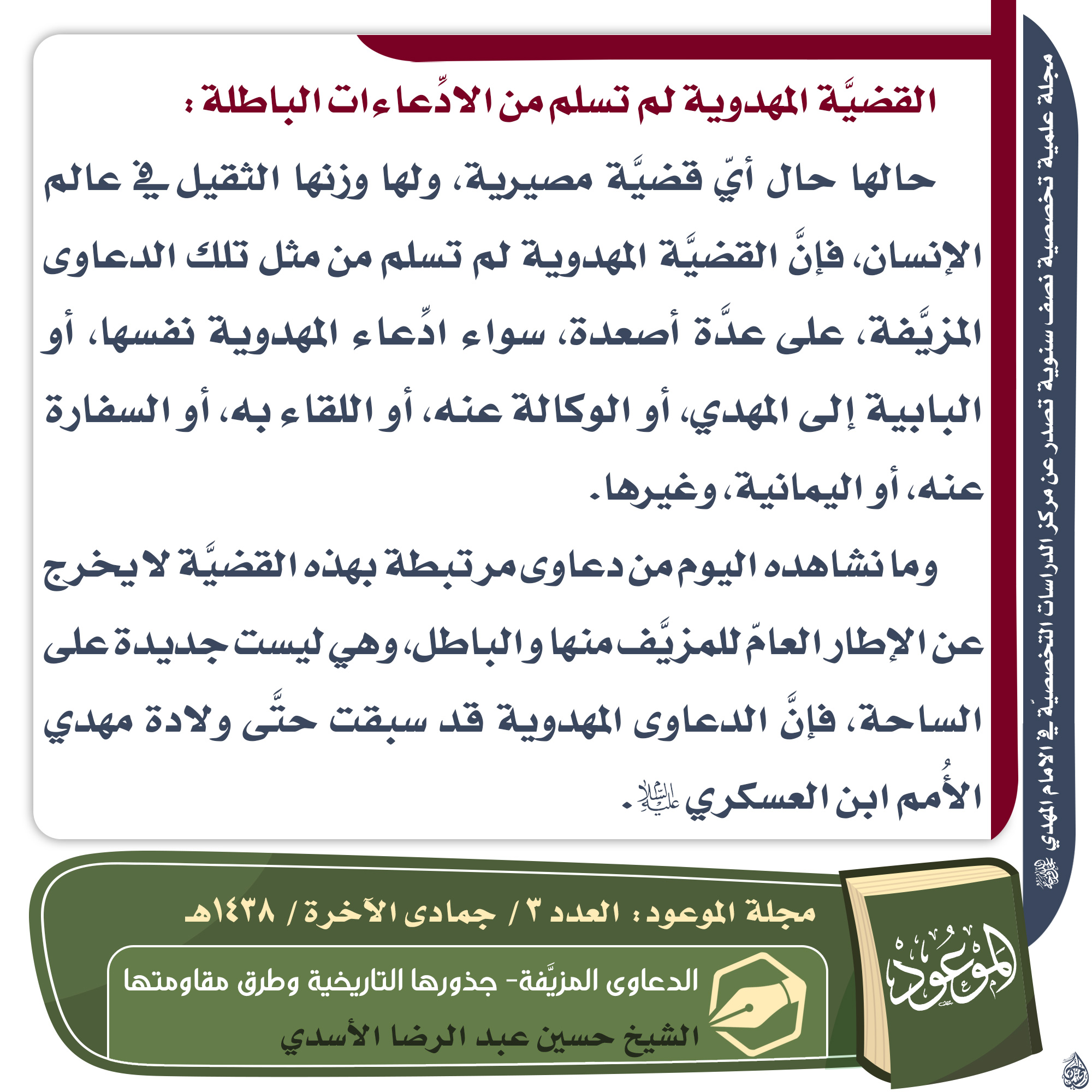 ? القضيَّة المهدوية لم تسلم من الادِّعاءات الباطلة: حالها حال أيّ قضيَّة مصيرية، ولها وزنها الثقيل في عالم الإنسان، فإنَّ القضيَّة المهدوية لم تسلم من مثل تلك الدعاوى المزيَّفة، على عدَّة أصعدة، سواء ادِّعاء المهدوية نفسها، أو البابية إلى المهدي، أو الوكالة عنه، أو اللقاء به،…