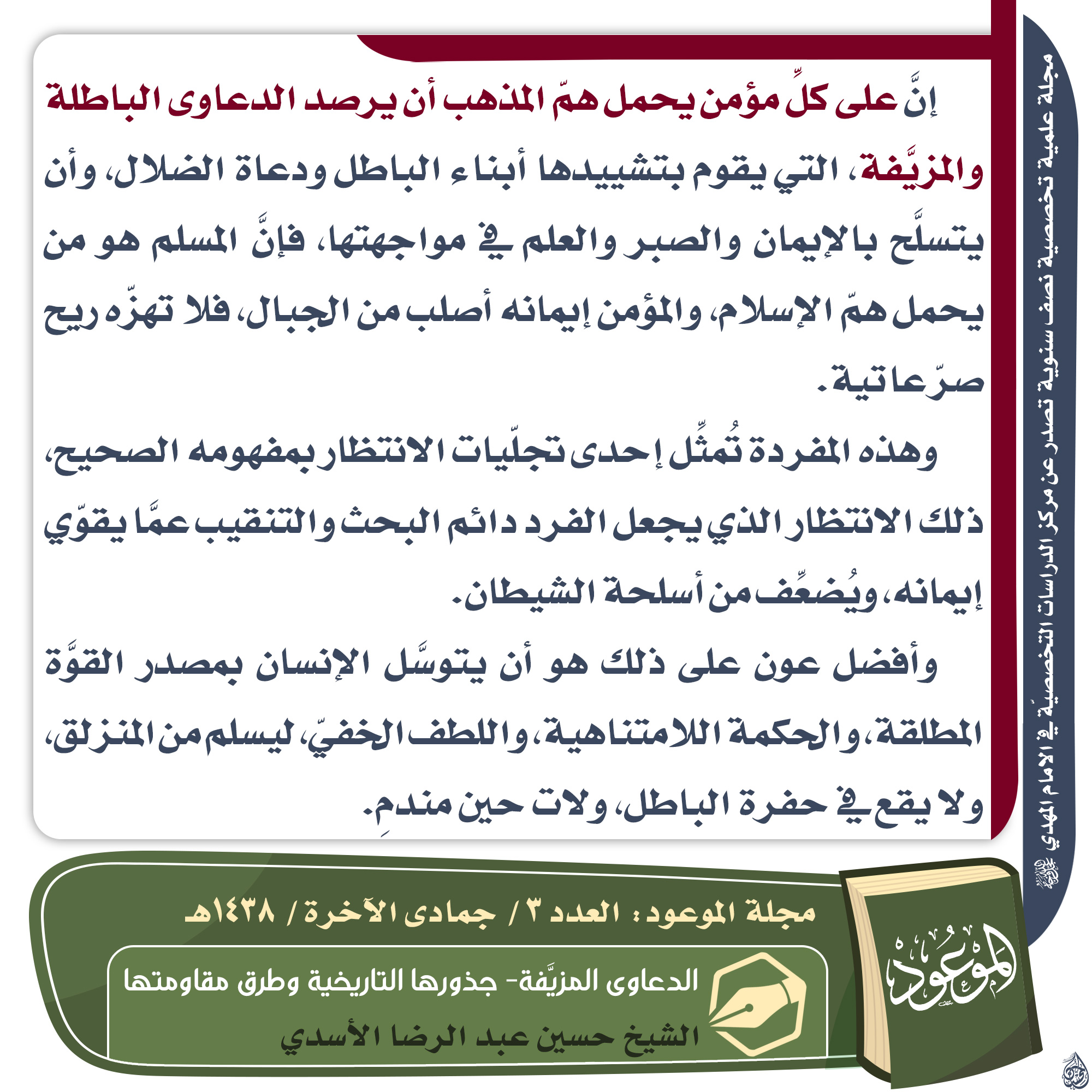 ? إنَّ على كلِّ مؤمن يحمل همّ المذهب أن يرصد الدعاوى الباطلة والمزيَّفة، التي يقوم بتشييدها أبناء الباطل ودعاة الضلال، وأن يتسلَّح بالإيمان والصبر والعلم في مواجهتها، فإنَّ المسلم هو من يحمل همّ الإسلام، والمؤمن إيمانه أصلب من الجبال، فلا تهزّه ريح صرّ عاتية. وهذه المفردة تُمثِّل…