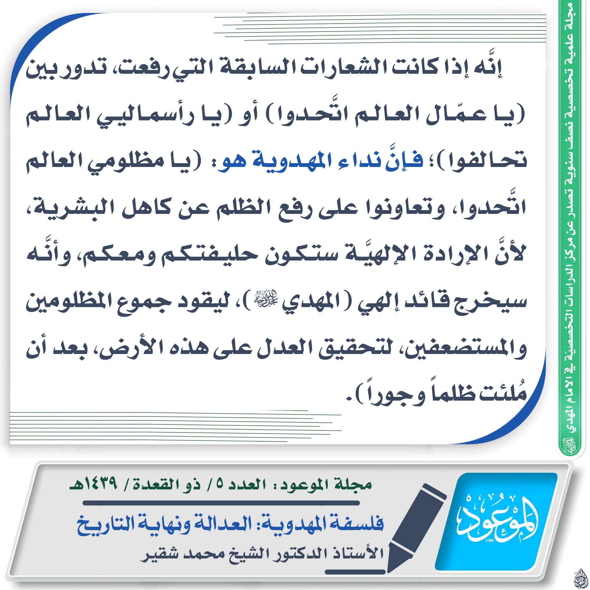 ?العدد ٥/ ذو القعدة/ ١٤٣٩ هـ ? مقتطف من مقال: فلسفة المهدوية: العدالة ونهاية التاريخ ✍? الكاتب: الدكتور الشيخ محمد شقير ? للاطلاع على المقال من خلال حقل التحميلات في الأسفل ?