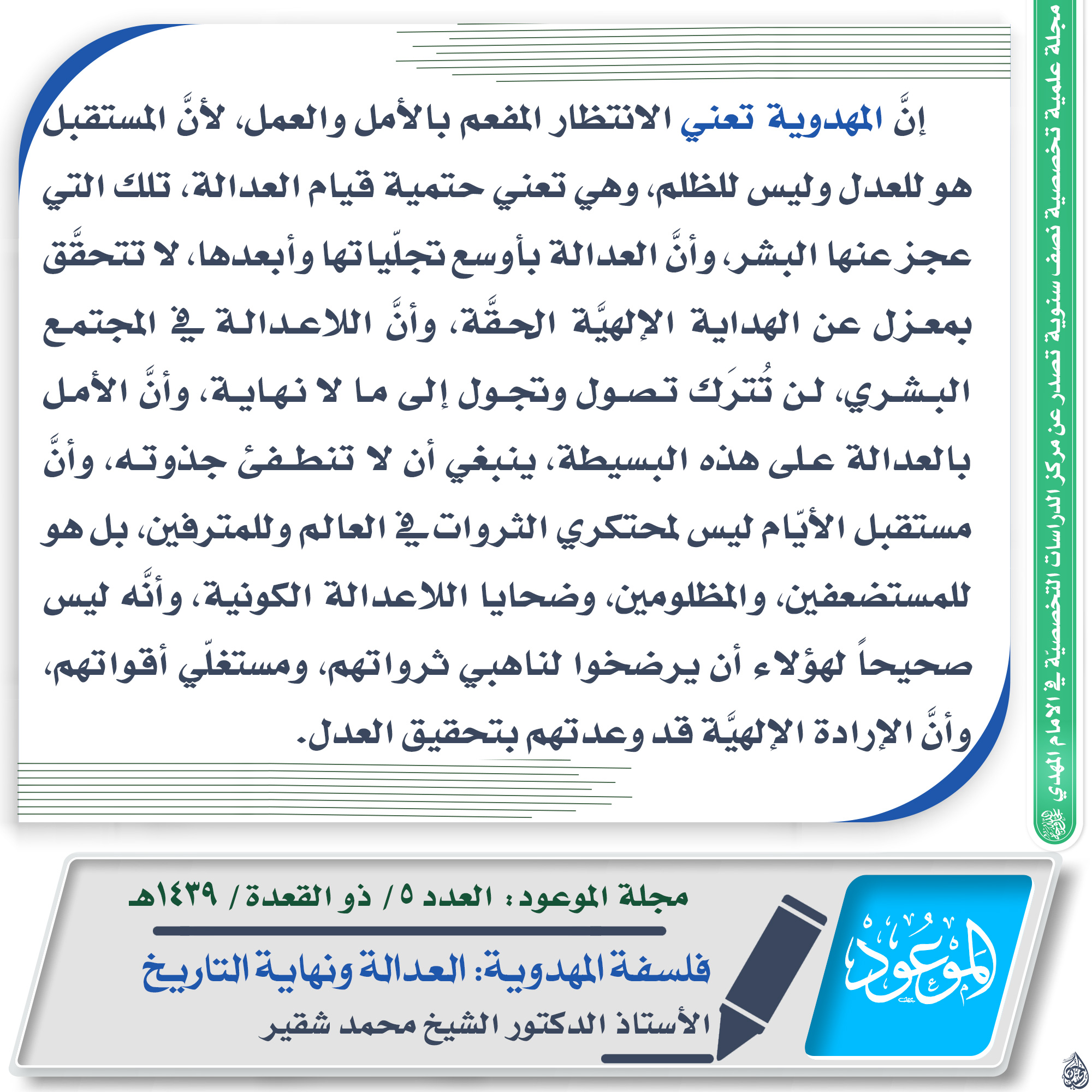 ?العدد ٥/ ذو القعدة/ ١٤٣٩ هـ ? مقتطف من مقال: فلسفة المهدوية: العدالة ونهاية التاريخ ✍? الكاتب: الدكتور الشيخ محمد شقير ? للاطلاع على المقال من خلال حقل التحميلات في الأسفل ?