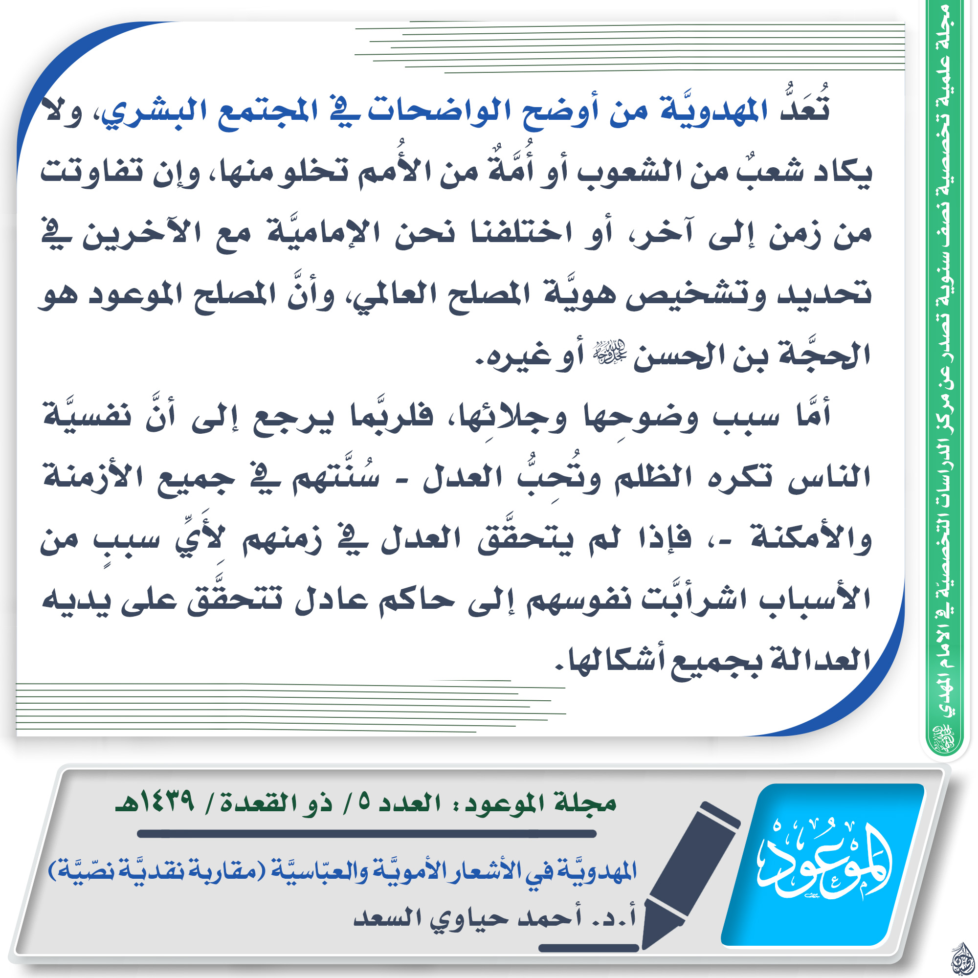 ?العدد ٥/ ذو القعدة/ ١٤٣٩ هـ ? مقتطف من مقال: المهدويَّة في الأشعار الأمويَّة والعبّاسيَّة (مقاربة نقديَّة نصّيَّة) ✍? الكاتب: أ.د. أحمد حياوي السعد ? للاطلاع على المقال من خلال حقل التحميلات في الأسفل ?