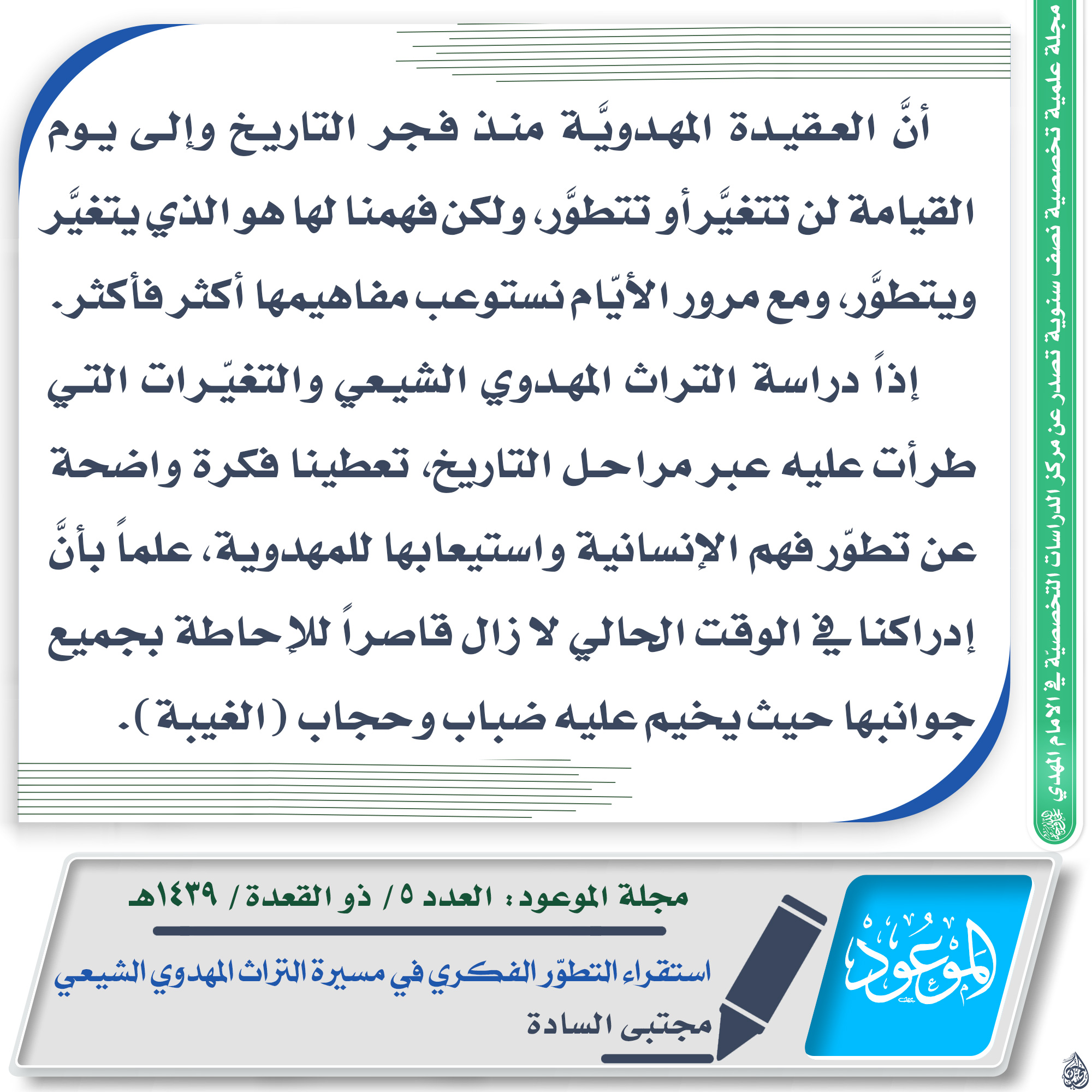 ?العدد ٥/ ذو القعدة/ ١٤٣٩ هـ ? مقتطف من مقال: استقراء التطوّر الفكري في مسيرة التراث المهدوي الشيعي ✍? الكاتب: مجتبى السادة ? للاطلاع على المقال من خلال حقل التحميلات في الأسفل ?