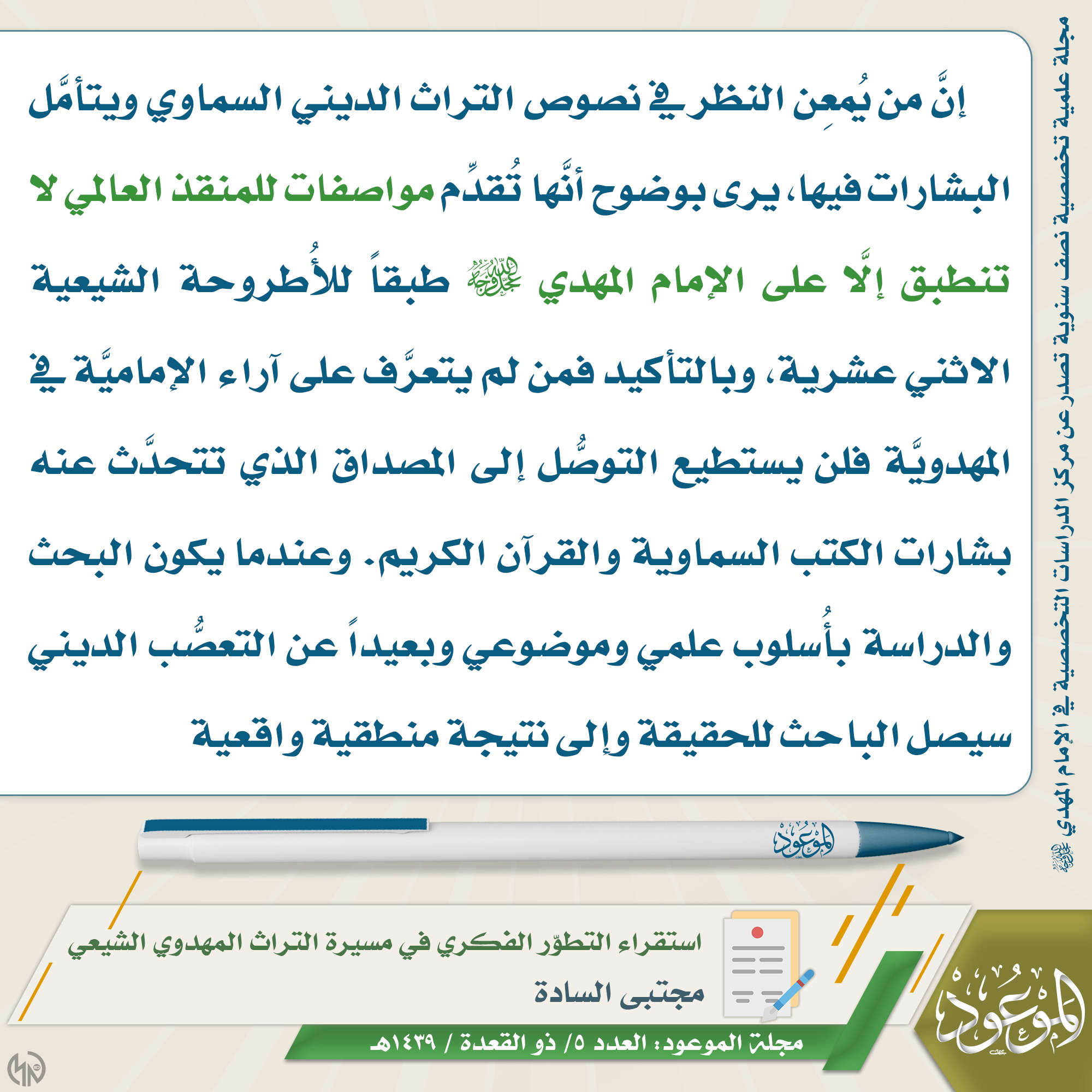 ?العدد ٥/ ذو القعدة/ ١٤٣٩ هـ ? مقتطف من مقال: استقراء التطوّر الفكري في مسيرة التراث المهدوي الشيعي ✍? الكاتب: مجتبى السادة ? للاطلاع على المقال من خلال حقل التحميلات في الأسفل ?