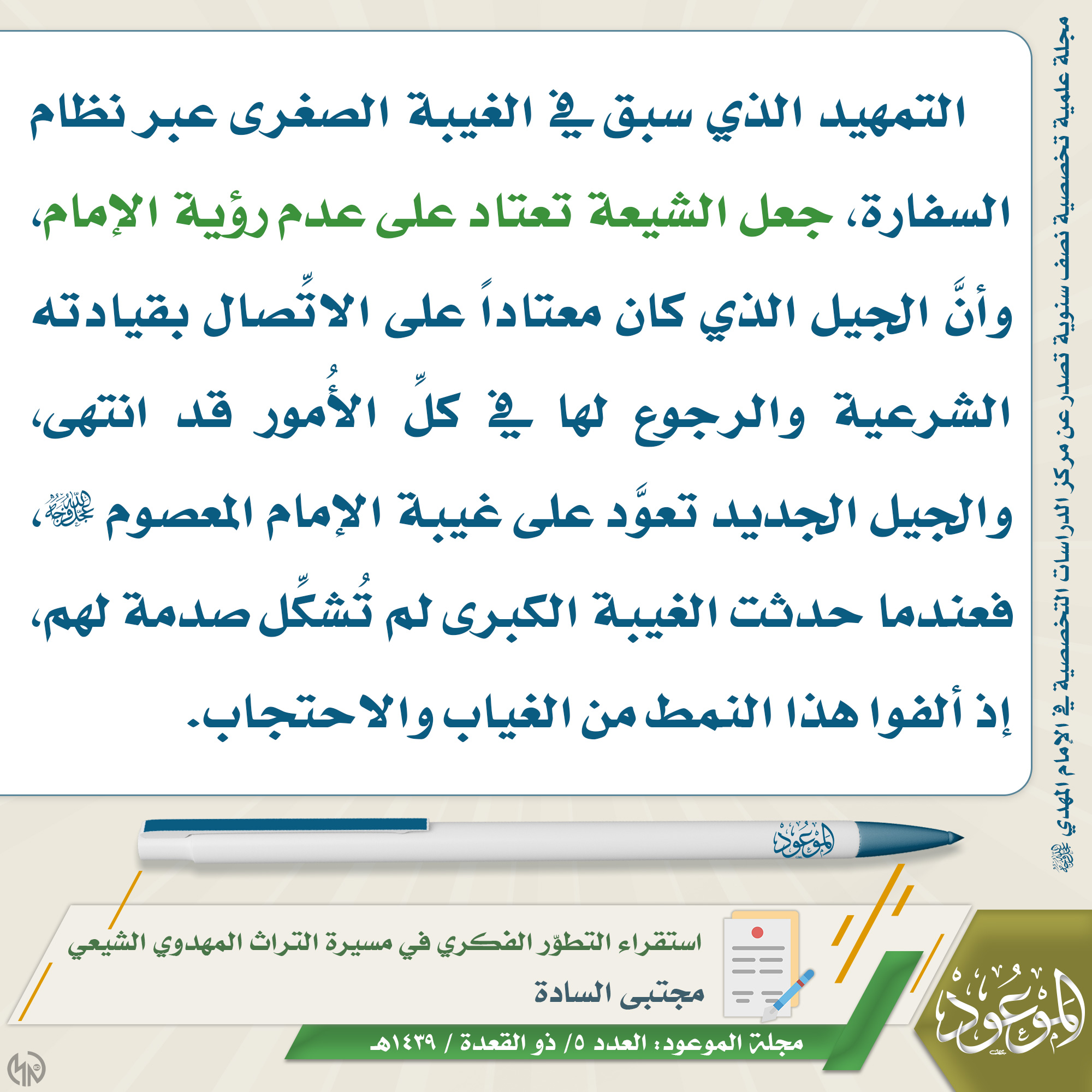 ?العدد ٥/ ذو القعدة/ ١٤٣٩ هـ ? مقتطف من مقال: استقراء التطوّر الفكري في مسيرة التراث المهدوي الشيعي ✍? الكاتب: مجتبى السادة ? للاطلاع على المقال من خلال حقل التحميلات في الأسفل ?