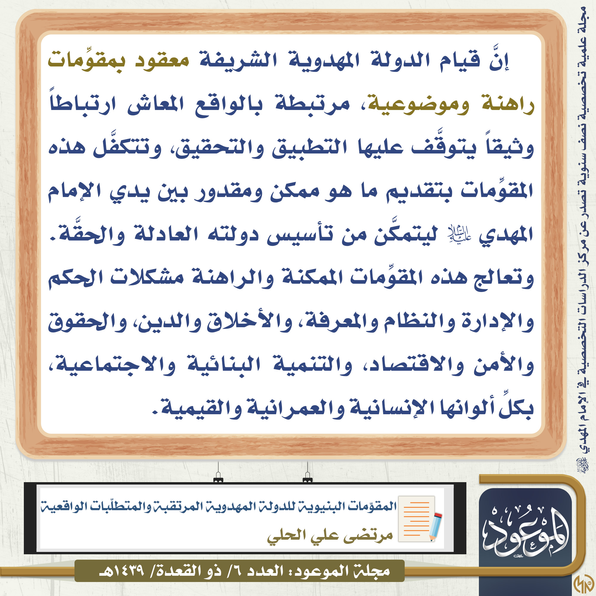 ?العدد ٦/ ذو القعدة/ ١٤٣٩ هـ ? مقتطف من مقال: المقوّمات البنيوية للدولة المهدوية المرتقبة والمتطلّبات الواقعية ✍? الكاتب: مرتضى علي الحلي ? للاطلاع على المقال من خلال حقل التحميلات في الأسفل ?