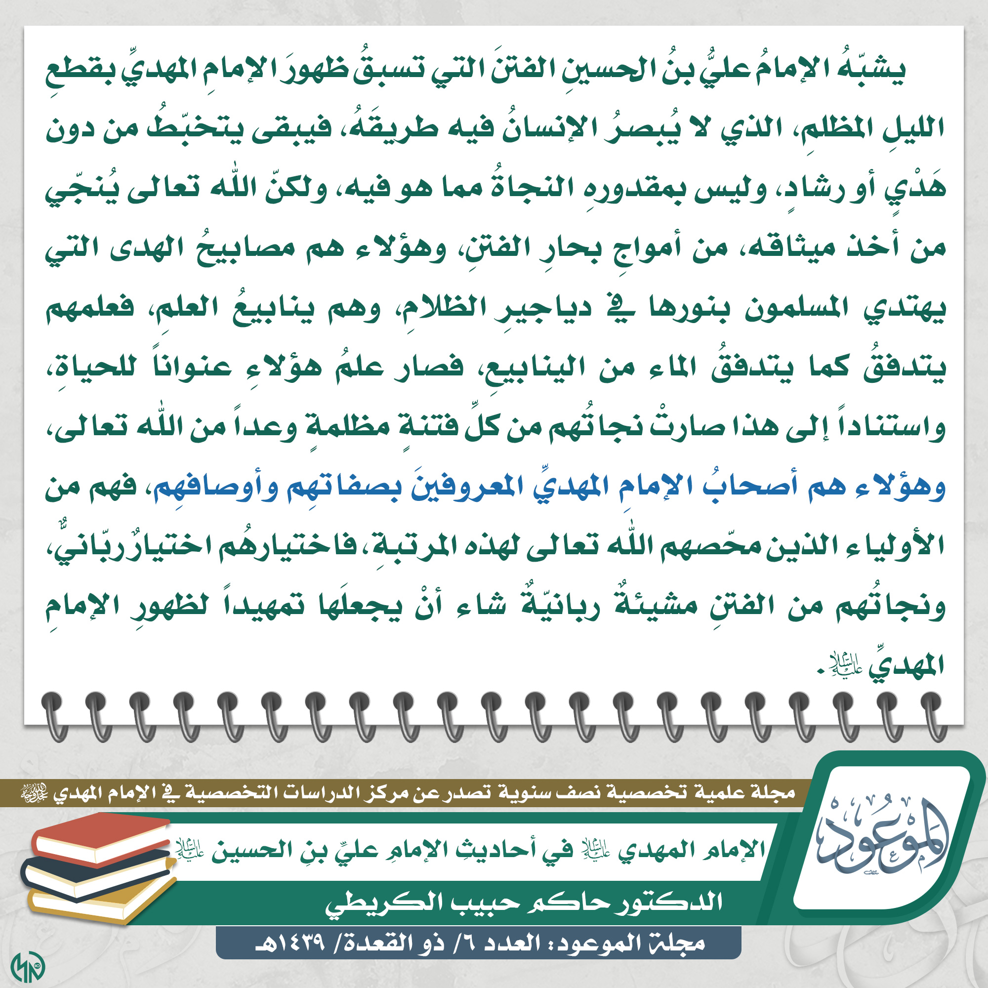 ?العدد ٦/ ذو القعدة/ ١٤٣٩ هـ ? مقتطف من مقال: الإمام المهدي (عليه السلام) في أحاديثِ الإمامِ عليِّ بنِ الحسين (عليه السلام) ✍? الكاتب: الدكتور حاكم حبيب الكريطي ? للاطلاع على المقال من خلال حقل التحميلات في الأسفل ?