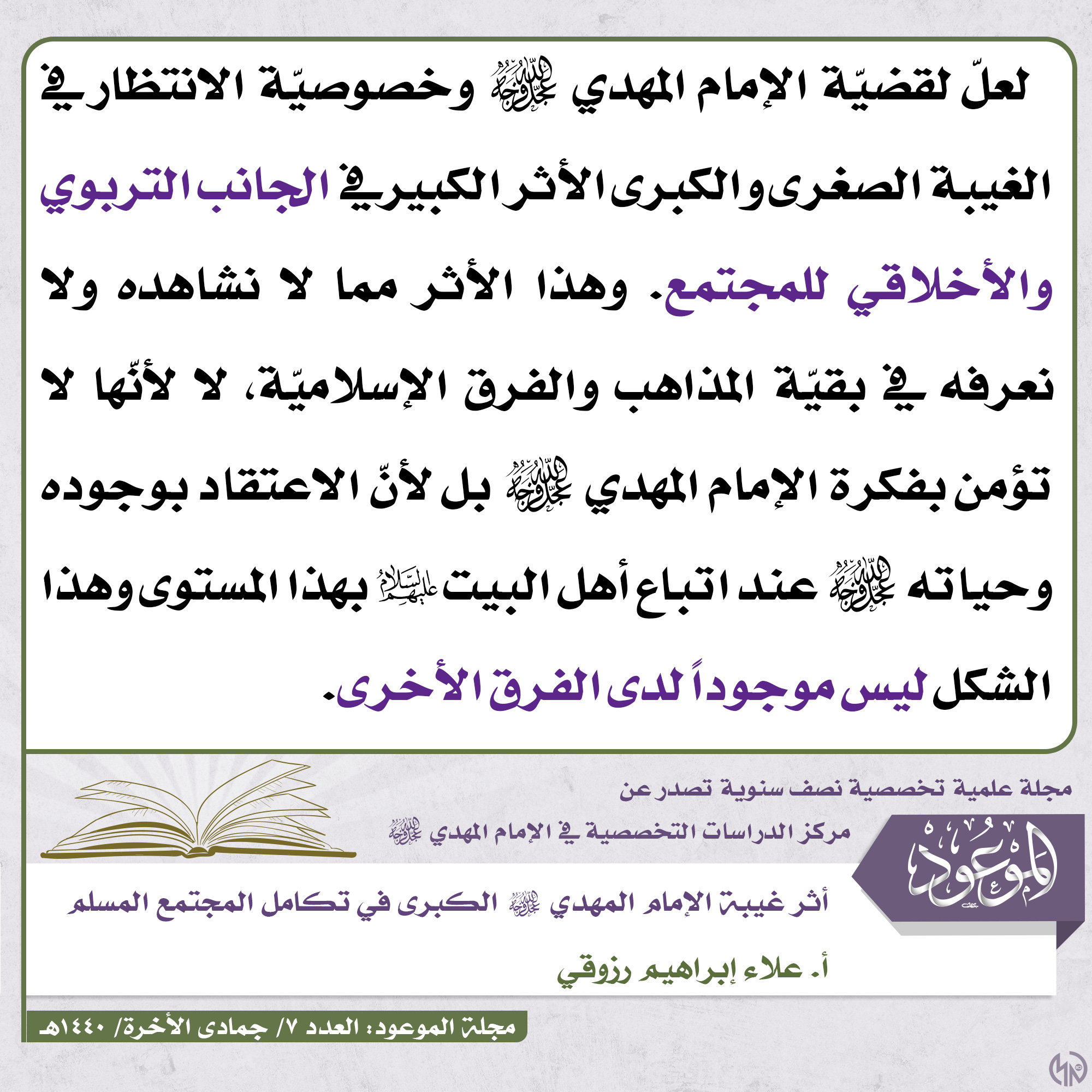 ?العدد ٧/ جمادي الآخر/ ١٤٤٠ هـ ? مقتطف من مقال: أثر غيبة الإمام المهدي (عجّل الله فرجه) الكبرى في تكامل المجتمع المسلم ✍? الكاتب: أ. علاء إبراهيم رزوقي ? للاطلاع على المقال من خلال حقل التحميلات في الأسفل ?
