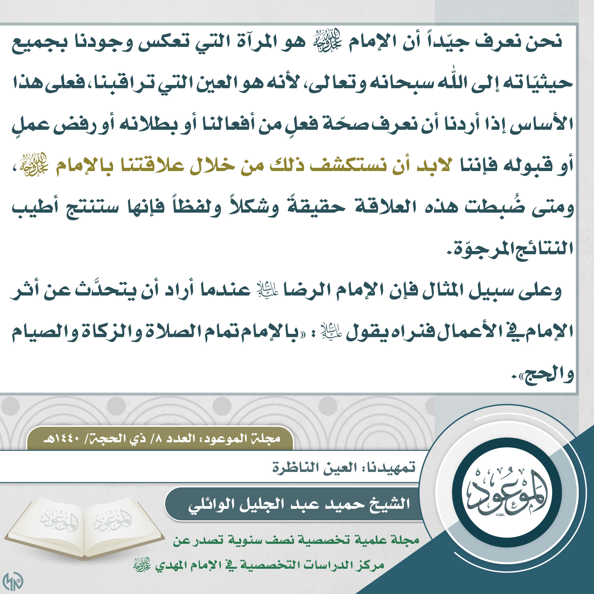 ?العدد ٨/ ذي الحجة/ ١٤٤٠ هـ ? مقتطف من مقال: تمهيدنا: العين الناظرة ✍? الكاتب: الشيخ حميد عبد الجليل الوائلي ? للاطلاع على المقال من خلال حقل التحميلات في الأسفل ?