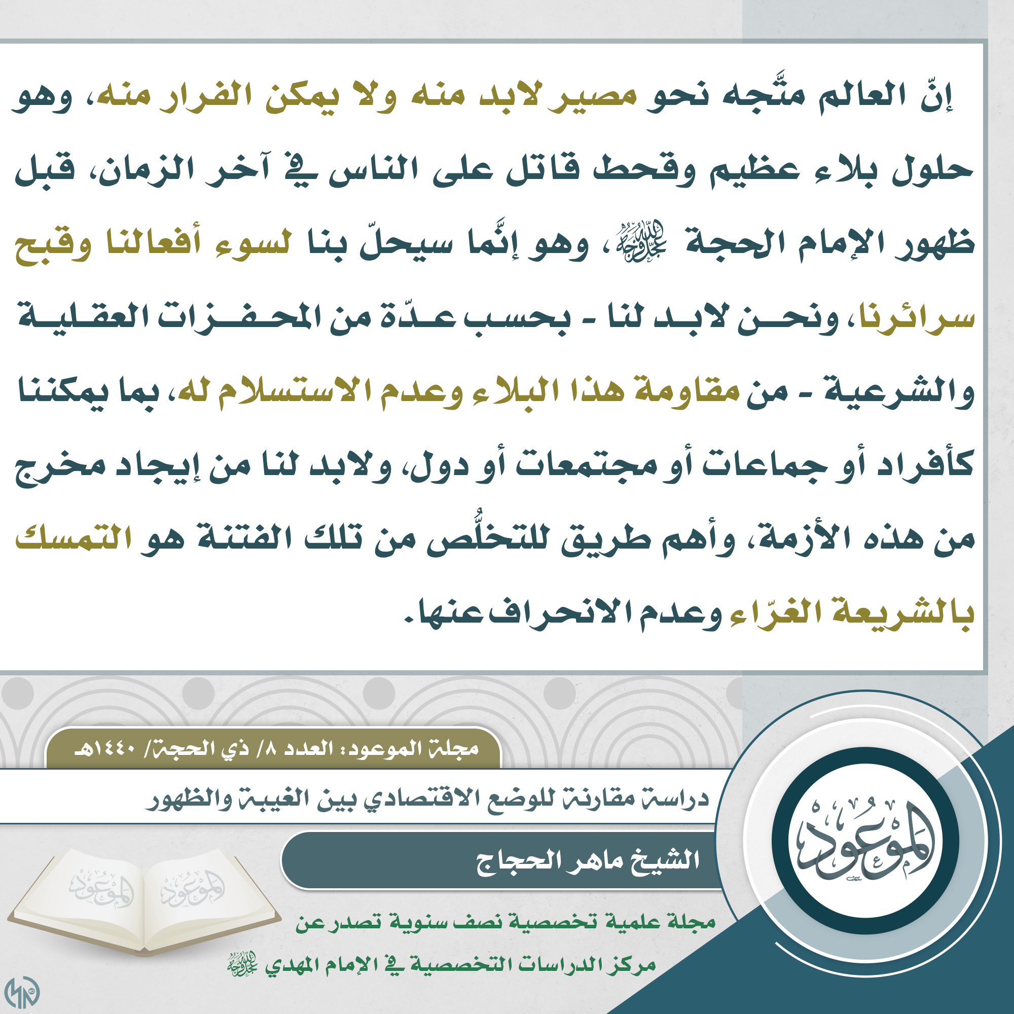 ?العدد ٨/ ذي الحجة/ ١٤٤٠ هـ ? مقتطف من مقال: دراسة مقارنة للوضع الاقتصادي بين الغيبة والظهور ✍? الكاتب: الشيخ ماهر الحجاج ? للاطلاع على المقال من خلال حقل التحميلات في الأسفل ?