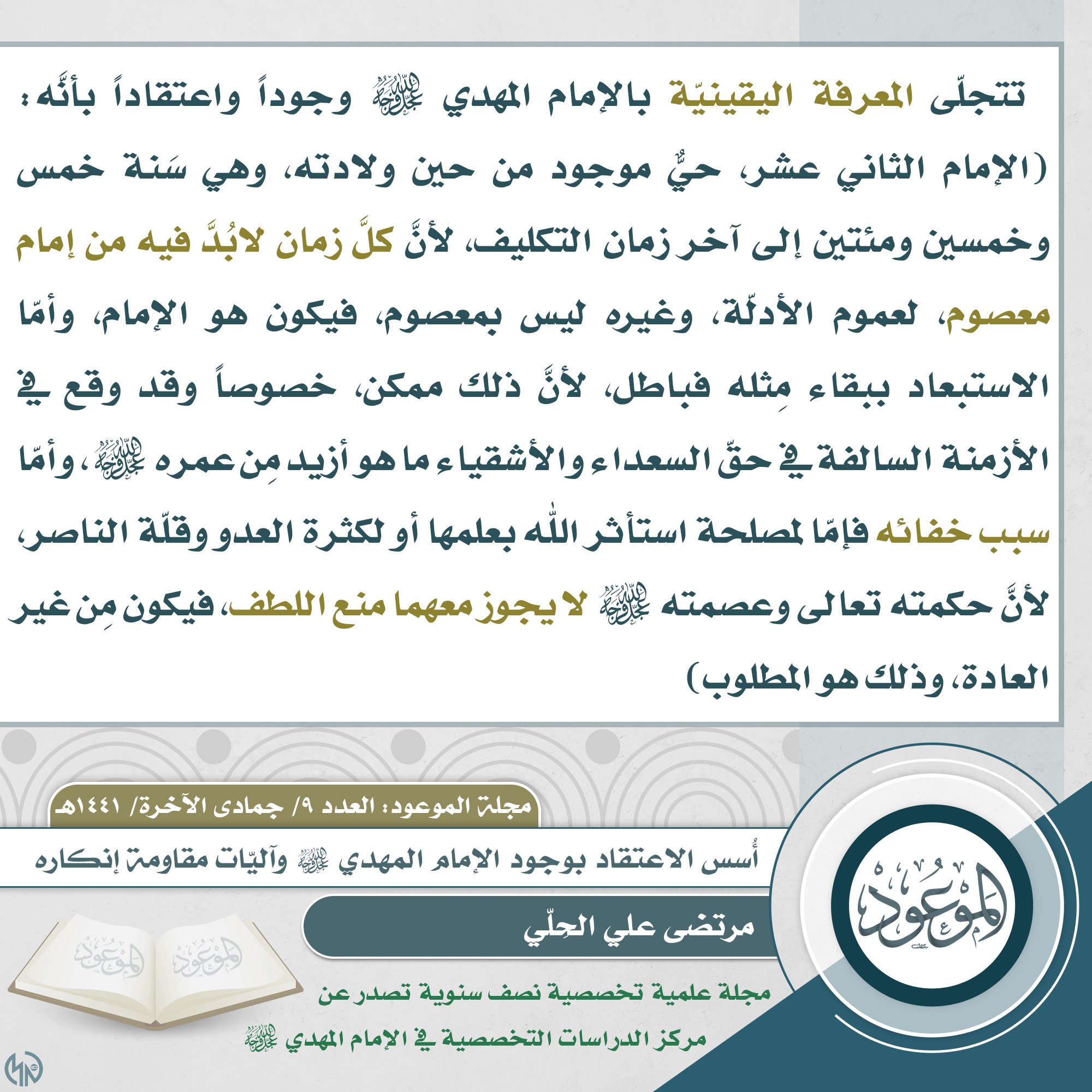 ?العدد ٩/ جمادى الآخرة/ ١٤٤١ هـ ? مقتطف من مقال: أُسس الاعتقاد بوجود الإمام المهدي (عجّل الله فرجه) وآليّات مقاومة إنكاره ✍? الكاتب: مرتضى علي الحِلّي ? للاطلاع على المقال من خلال حقل التحميلات في الأسفل ?