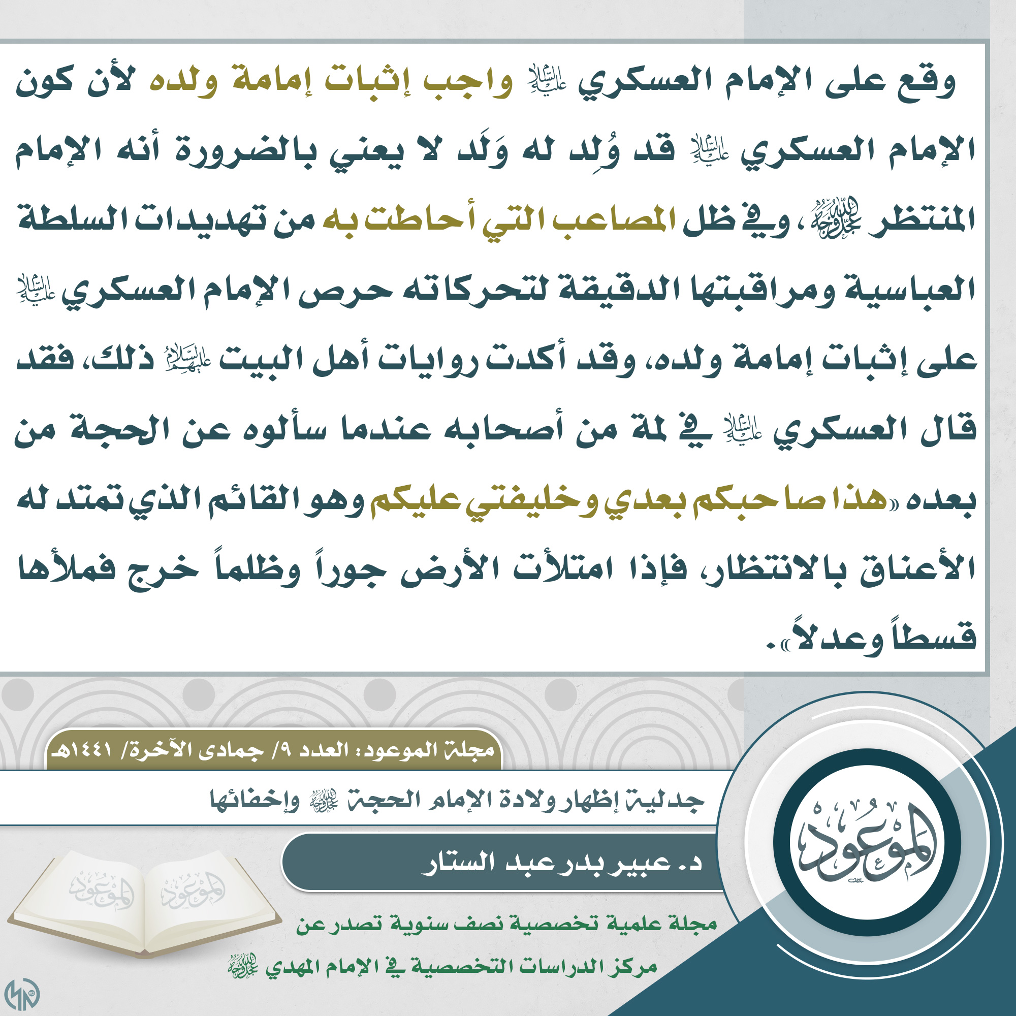 ?العدد ٩/ جمادى الآخرة/ ١٤٤١ هـ ? مقتطف من مقال: جدلية إظهار ولادة الإمام الحجة (عجّل الله فرجه) وإخفائها ✍? الكاتب: د. عبير بدر عبد الستار ? للاطلاع على المقال من خلال حقل التحميلات في الأسفل ?