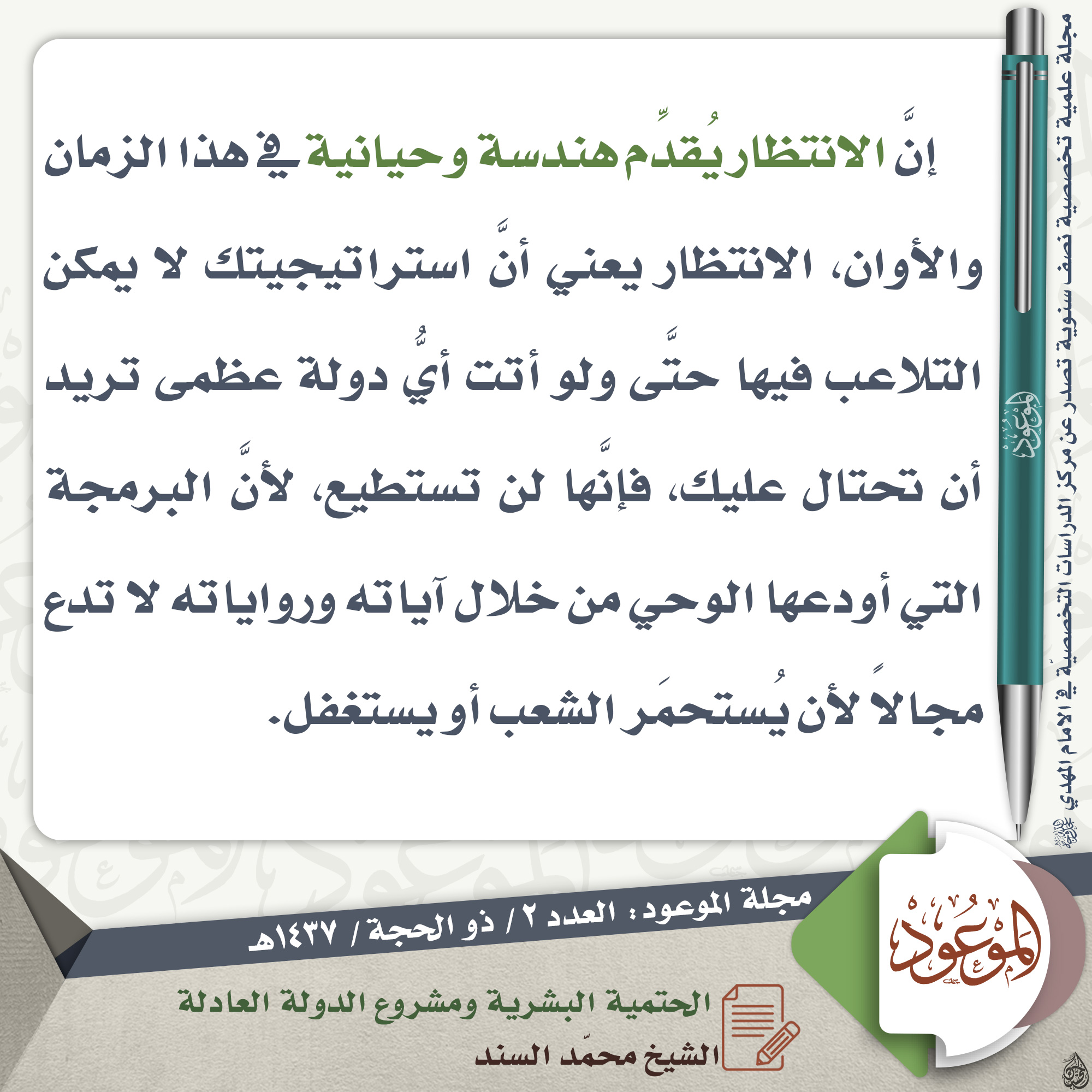 ?إنَّ الانتظار يُقدِّم هندسة وحيانية في هذا الزمان والأوان، الانتظار يعني أنَّ استراتيجيتك لا يمكن التلاعب فيها حتَّى ولو أتت أيُّ دولة عظمى تريد أن تحتال عليك، فإنَّها لن تستطيع، لأنَّ البرمجة التي أودعها الوحي من خلال آياته ورواياته لا تدع مجالاً لأن يُستحمَر الشعب أو يستغفل.…