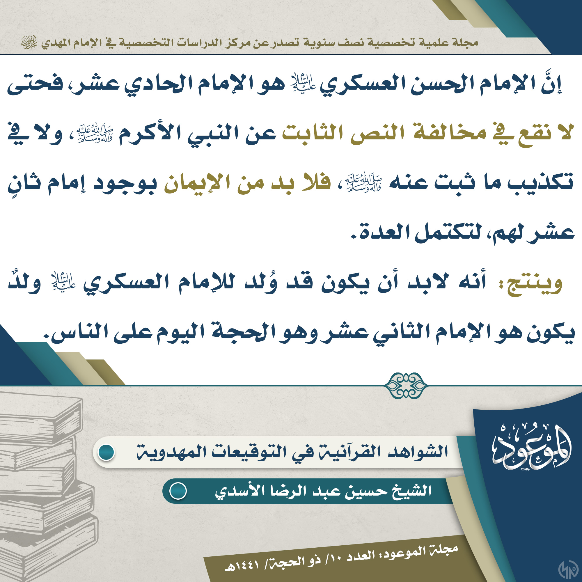 ?العدد ١٠/ ذو الحجة/ ١٤٤١ هـ ? مقتطف من مقال: الشواهد القرآنية في التوقيعات المهدوية ✍? الكاتب: الشيخ حسين عبد الرضا الأسدي ? للاطلاع على المقال من خلال حقل التحميلات في الأسفل ?