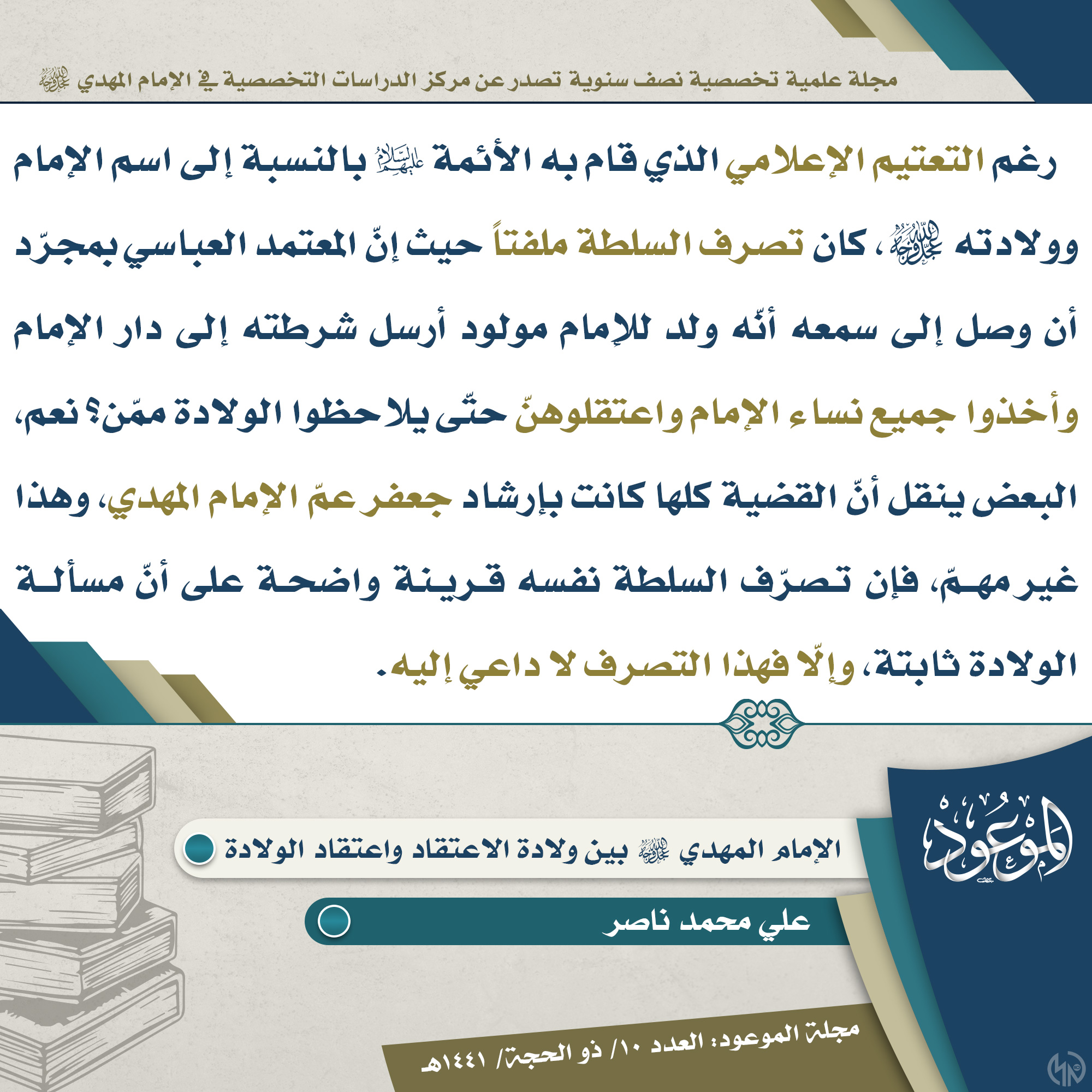?العدد ١٠/ ذو الحجة/ ١٤٤١ هـ ? مقتطف من مقال: الإمام المهدي (عجَّل الله فرجه) بين ولادة الاعتقاد واعتقاد الولادة ✍? الكاتب: علي محمد ناصر ? للاطلاع على المقال من خلال حقل التحميلات في الأسفل ?