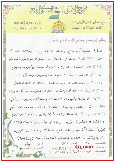 السلام على من أراه بقلبي وعقلي في كل زمان ومكان السلام على منقذ الأمة من هذه الغمة ... السلام على النور الساطع السلام على العدل الفارع, السلام عليك ياسيدي ومولاي ياقائم آل محمد: ماذا أقول لك ياسيدي ومولاي: وماذا أصف لك عن زماني هذا الظلم, القتل, الشر, سلب الحقوق, هتك الأعراض, الفقر, التشرد, حياتنا كحياة الغابة للأقوى ياسيدي, أناشدك وأسألك ياحبيبي ويامولاي متى ... متى الظهور ياسيدي انقذنا, أغثنا, ساعدنا, اظهر ياحبيبي وانشر القسط والعدل في أمتك وخلصنا من الظلم والكفر والكفرة نريد رجعتك ياسيدي طالت غيبتك كثيراً كثيراً: سيدي هذه التي تخاطبك واحدة من الملايين الذين ينتظرون ظهورك العظيم (خادمة آل بيت الرسول صلى الله عليه وآله).