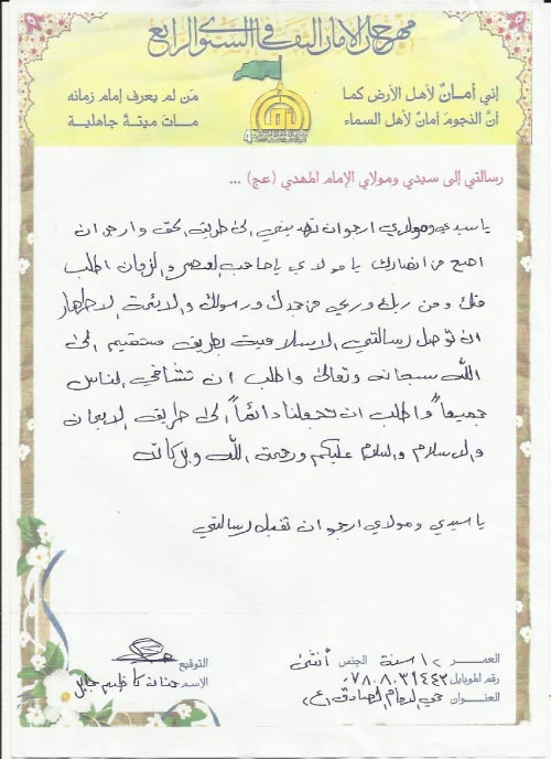 ياسيدي ومولاي أرجوأنْ تهديني الى طريق الحق وأرجوأنْ اصبح من انصارك،يامولايياصاحب العصر والزمان اطلب منك ومن ربّك وربّي، من جدّك ورسول الله، والائمّة الأطهار أنْ توصل رسالتي الإسلامية بطريق مستقيم إلى الله سبحانه وتعالى، وأطلب أنْيشافى الناس جميعاً وأطلب أنْيجعلنا دائماً إلى طريق الإيمان والإسلام، والسلام عليكم ورحمة الله وبركاته