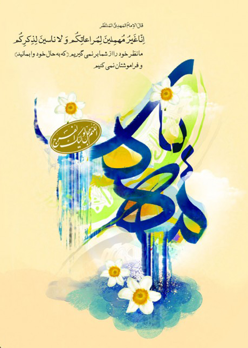 به نام خداوند بخشنده مهربان بار الها: ولی امرت امام زمان حجت بن الحسن را که درودهایت بر او وپدرانش باد در این هنگام وبرای همیشه سرپرست ونگهدار ورهبر ویاور وراهنما ونگاهبان باش تا گیتی را به فرمان او آوری وتا دیر زمان، بهره مندش گردانی | اَللّـهُمَّ کنْ لِوَلِیک الْحُجَّةِ بْنِ الْحَسَنِ صَلَواتُک عَلَیهِ وَعَلی آبائِه فی هذِهِ السَّاعَةِ وَفی کلِّ ساعَة وَلِیاً وَحافِظاً وَقائِداً وَناصِراً وَدَلیلاً وَعَیناً حَتّی تُسْکنَهُ اَرْضَک طَوْعاً وَتُمَتِّعَهُ فیها طَویلاً