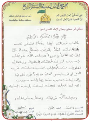 طالت غيبتك أيّها الامام المنتظَر نحن بانتظارك لتملأ الأرض قسطاً وعدلا كما ملأت ظلماً وجوراً، عجّل الله فرجك ياسيدي لنرى طلعتك البهية ووجهك المشرق، سلام عليك أينما كنت في البر أو في البحر، أنت موجود في قلوبنا وأتمنّى أنْ أكون من أنصارك سيدي، العجل العجل العجل الساعة الساعة الساعة.