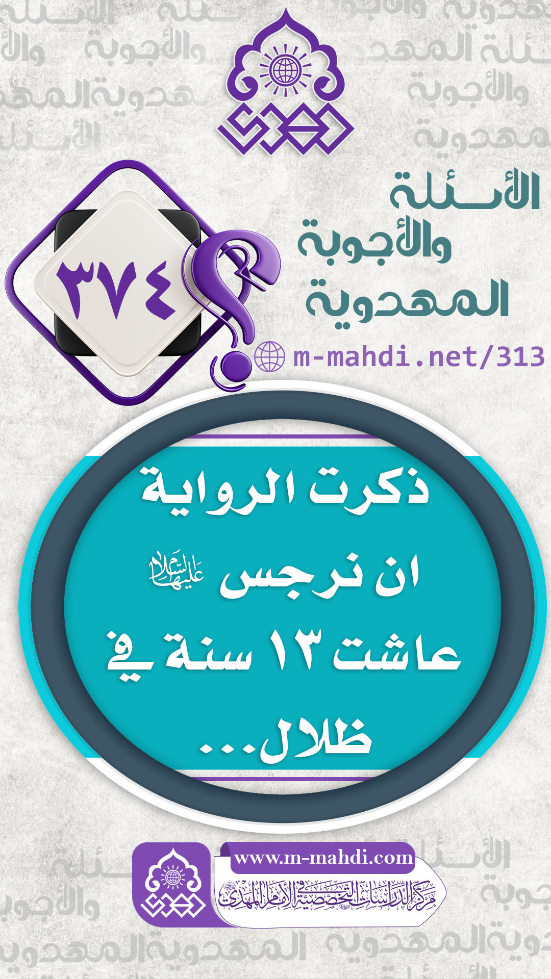 (٣٧٤) ذكرت الرواية ان نرجس (عليها السلام) عاشت ١٣ سنة في ظلال...
